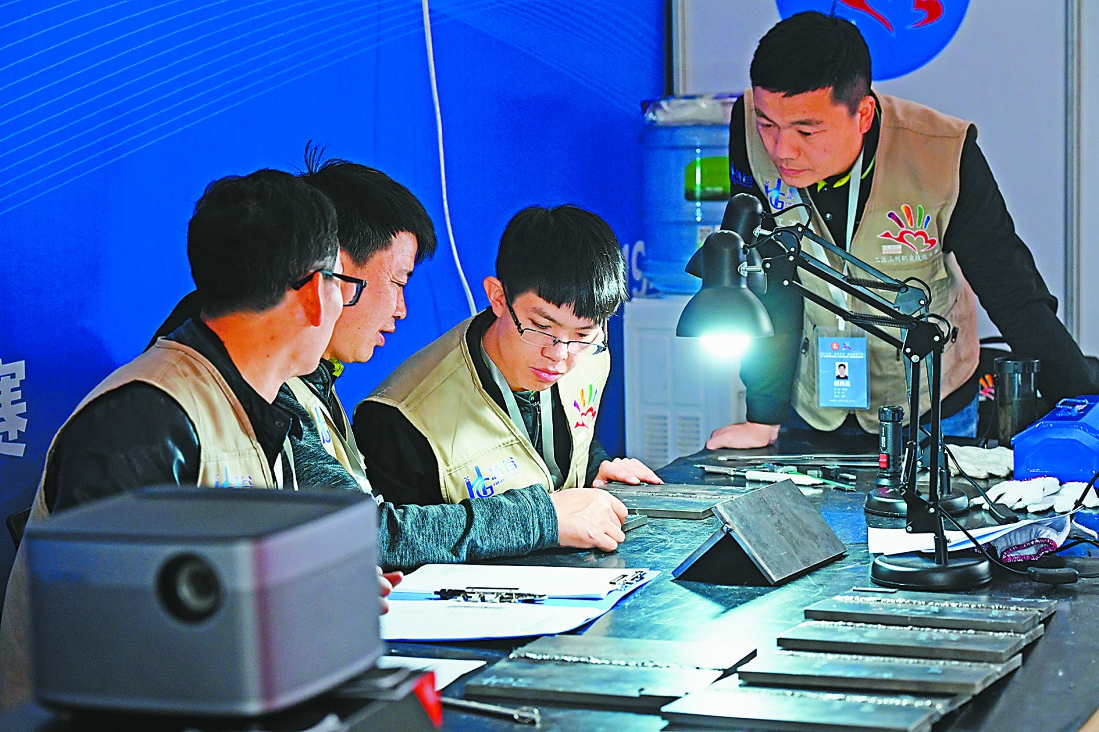第44届世界技能大赛焊接项目冠军选手宁显海(中)来到赛场,担任本次大赛的裁判。图为裁判在认真为选手作品评判打分