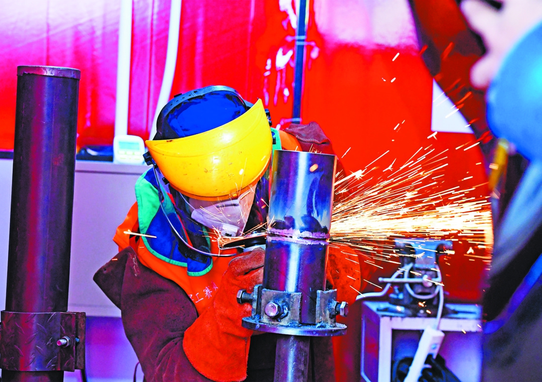 在比赛现场,焊工项目选手身着焊服,认真参赛孙兴伟摄