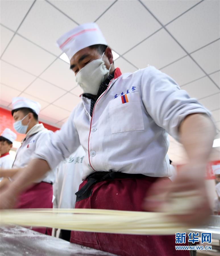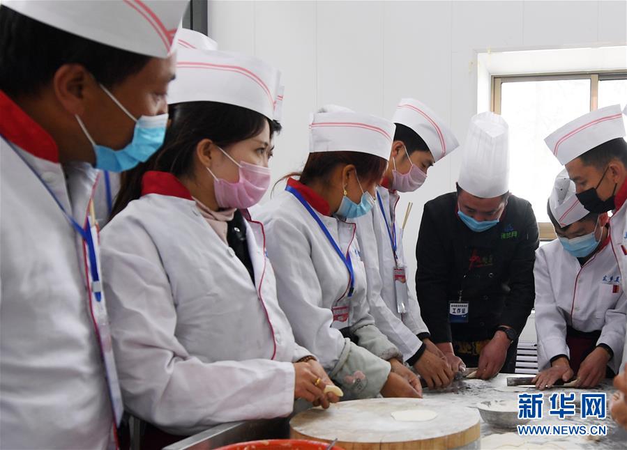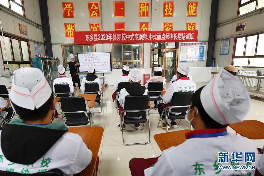 4月21日,在东乡县职业技术学校,中式烹饪培训班学员上实操课。近年来,“三区三州”深度贫困县——甘肃省临夏回族自治州东乡族自治县,针对当地18至45周岁的建档立卡贫困户、青壮年劳动力等群体,实施免费就业技能培训工程,开设牛肉拉面、中式烹饪、美容美发等技能专业。截至2019年底,累计培训1.4万余人,帮助贫困家庭劳动力脱贫致富。